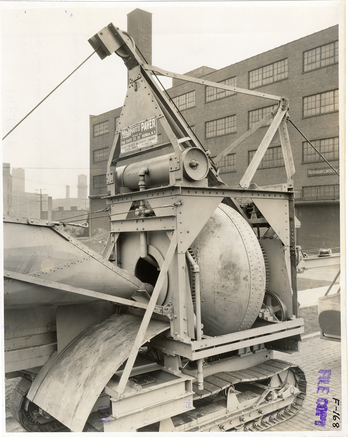 View of a Foote 21E MultiFoote mixer. Factory building in background. Typed on back: "F-168. Top frame construction, 1923 Model 21E. Photo taken Chgo. by CAECo.. 3/3/23."