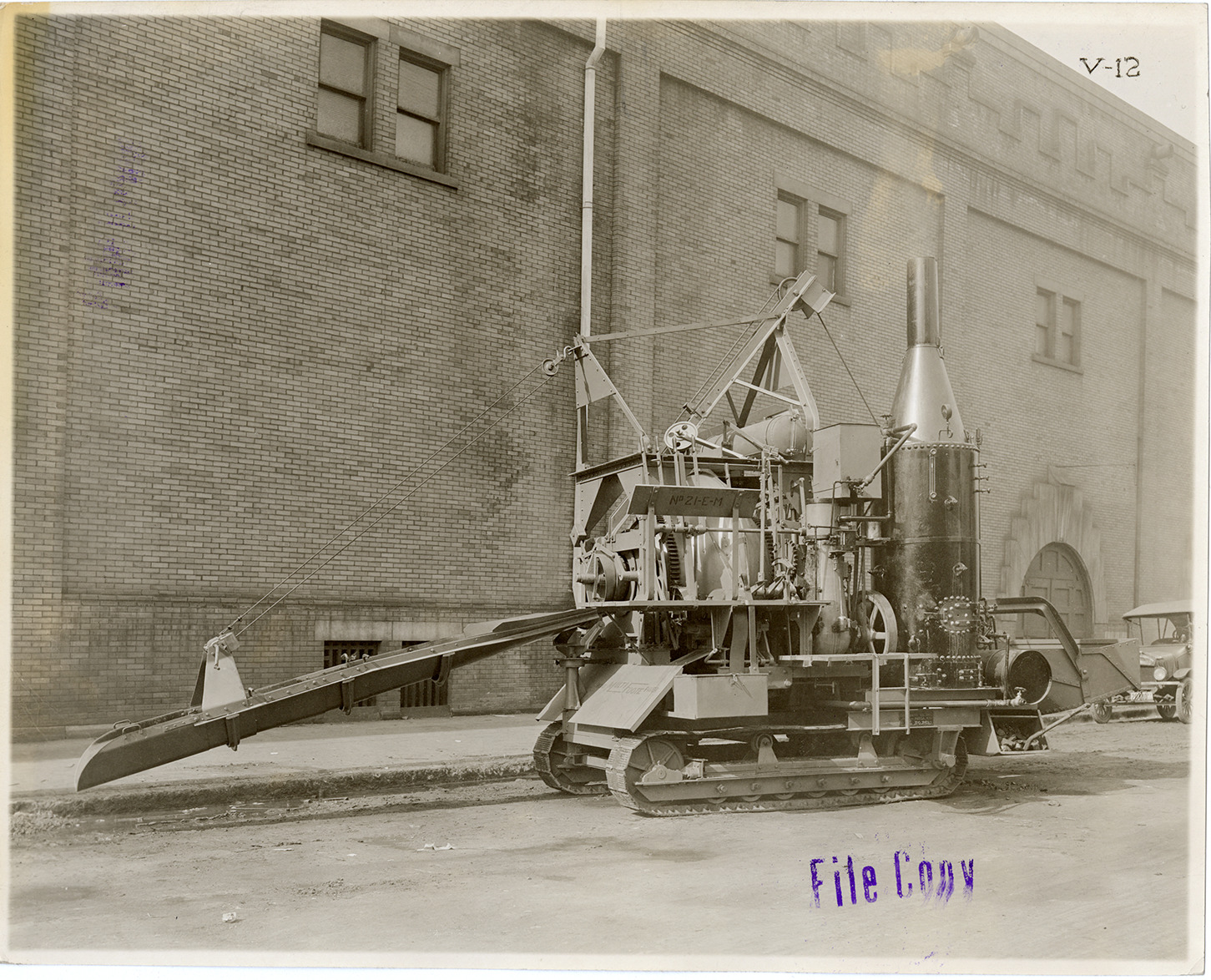 View of a Foote 21E MultiFoote mixer. Brick building in background. Typed on back: "Photographs of 21E MultiFoote mixer taken Good Roads Show, Louisville, Ky. Week of Feb. 9-14, 1920. V-12 Front left hand side of mixer showing discharge chute. Not retouched."