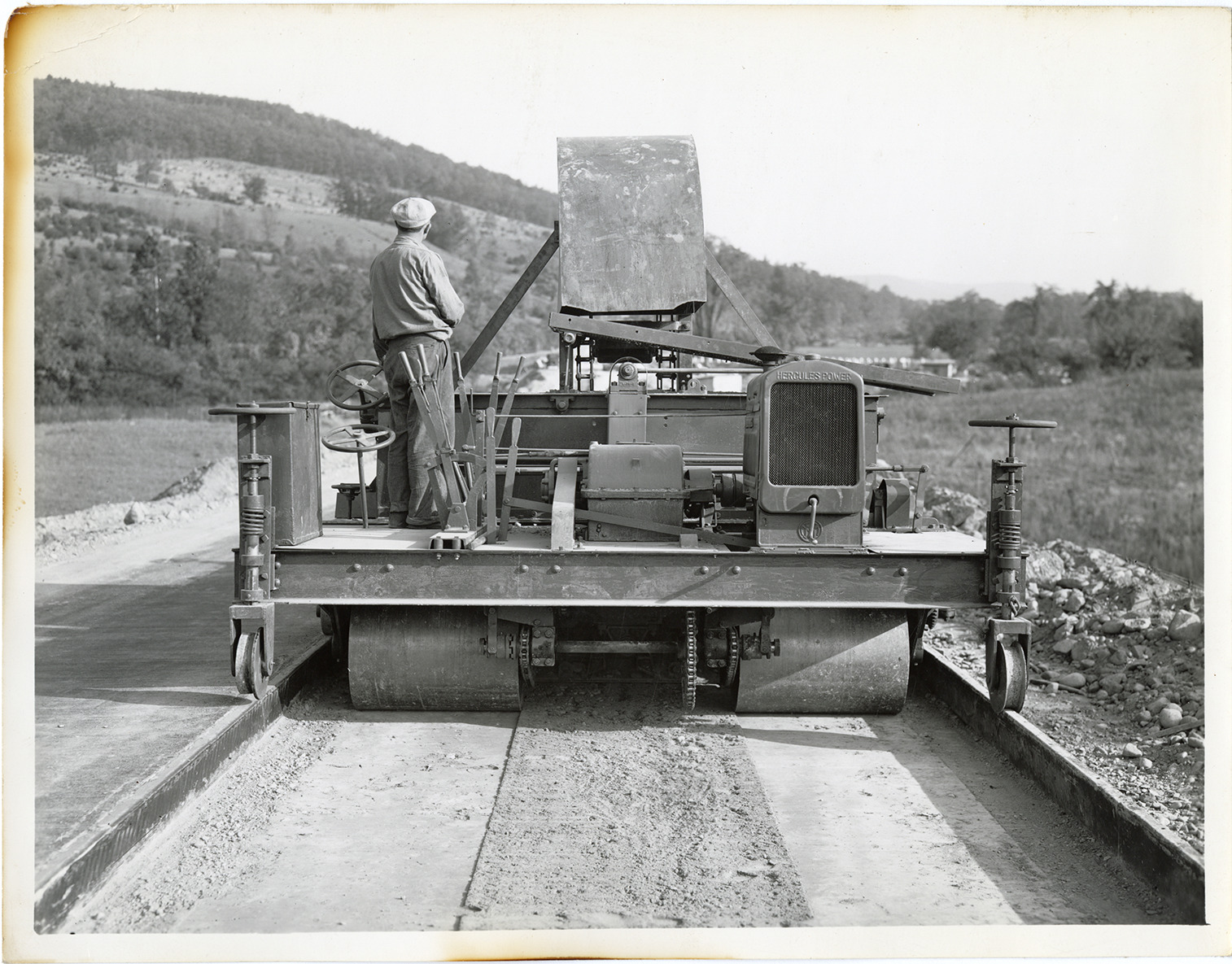 View of a man operating a Foote Timken-equipped 27E Road Show paver. Stamped on back: "Bath Photo Studio, G.Z. Atanesian. Phone, Bath, N.Y."
