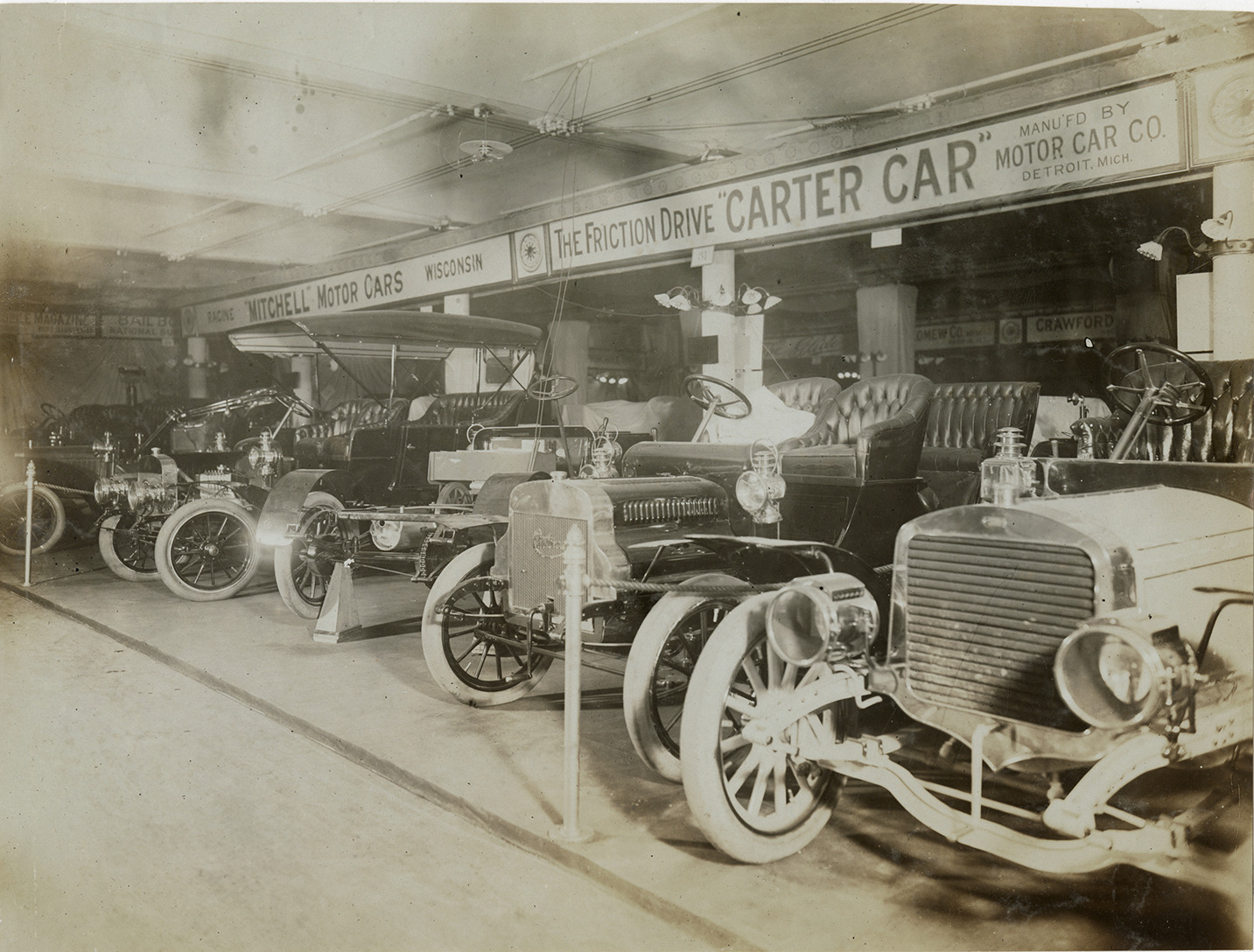 View of 1910 Cartercars and chassis on display at trade show. Sign over exhibit reads: "The friction drive 'Carter Car' manu'fd by Motor Car Co., Detroit, Mich." Stamped on back: "Spooner and Wells, 1931 Broadway, New York, duplicates any time, enlargements all sizes, tel. 3472-3473 Col., credit appreciated." Handwritten on back: "Cartercar."