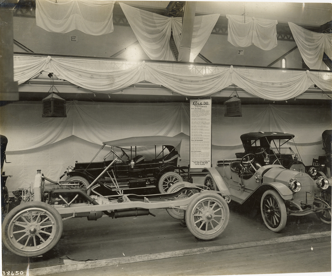 View of 1912 Cole cars and chassis on display at trade show. Stamped on back: "Spooner & Wells, Inc., photographers, telephones 3472-3473 Columbus, 1931 Broadway, New York." Handwritten on back: "Cole, 1912."