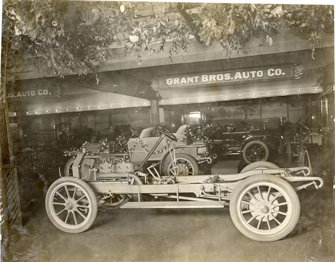 View of Grant cars and chassis on display during the 1910 Detroit Auto Show at the Wayne Hotel Gardens in Detroit, Michigan. "Grant Bros. Auto Co." sign displayed overhead. Stamped on back: "When this photograph is used for publication purposes in catalogues, pamphlets, etc. credit as follows will be appreciated: Photo by Spooner & Wells." Handwritten on back: "Det. Auto Show, 1910."