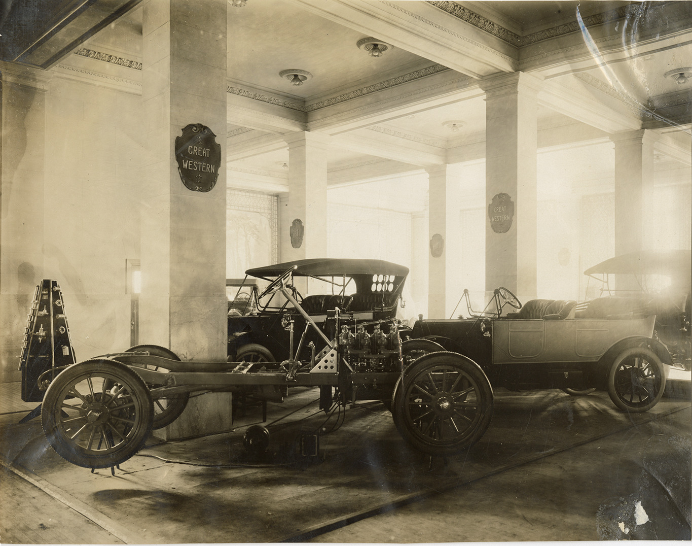 View of Great Western cars and chassis on display at trade show. "Great Western" signs on pillars. Stamped on back: "Spooner & Wells, Inc., photographers, telephones 3472-3473 Columbus, 1931 Broadway, New York." Handwritten on back: "1911-1912."