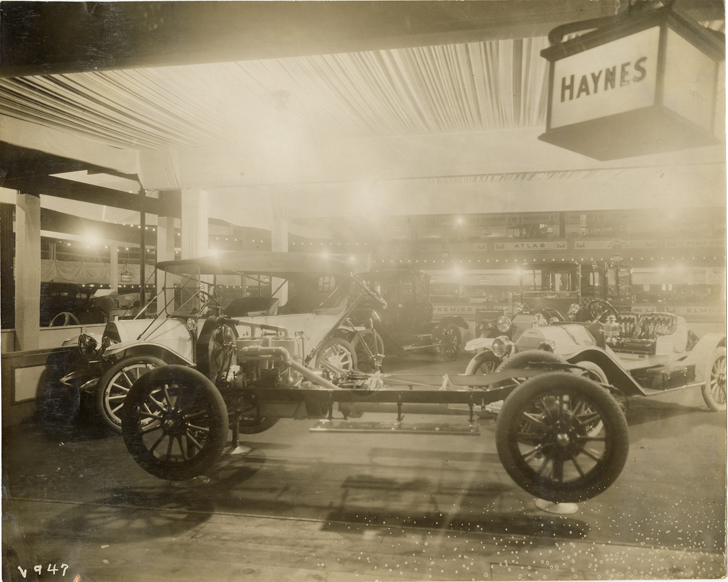 View of Haynes cars and chassis on display at trade show. "Haynes" sign on right. Stamped on back: "Spooner & Wells, Inc., photographers, telephones 3472-3473 Columbus, 1931 Broadway, New York." Handwritten on back: "1911-12."