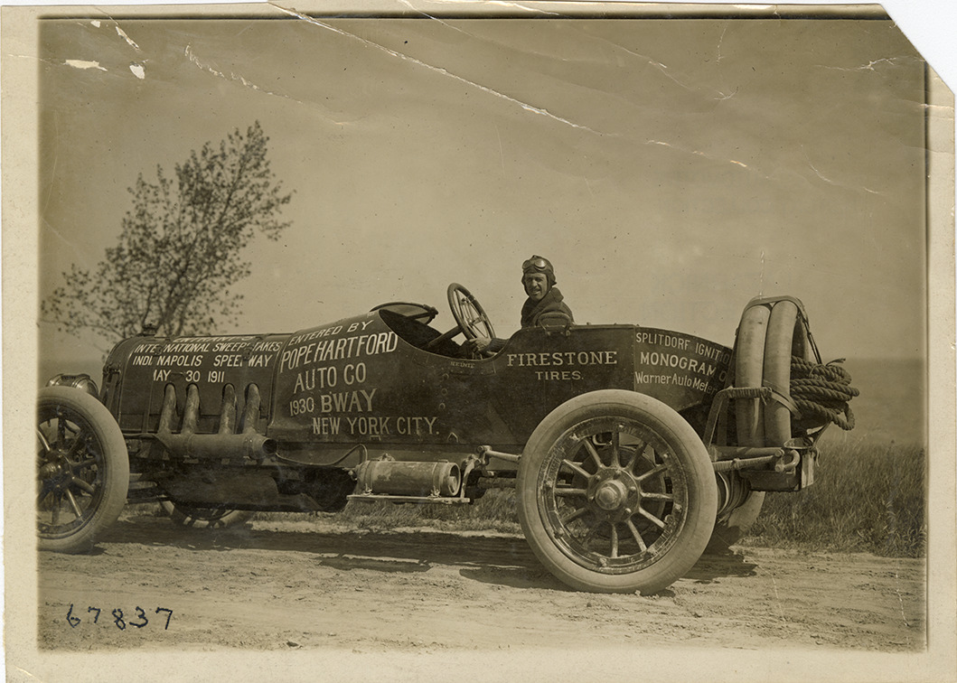 View of Louis Disbrow posing in Pope-Hartford racecar. Lettered on car: "Entered by Pope Hartford Auto Co, 1930 B'way, New York City. Firestone tires, Splitdorf ignition. Monogram [undecipherable]. Warner auto meter. International sweepstakes, Indianapolis Speedway, May 30, 1911. Heine." Stamped on back: "Spooner & Wells, Inc., photographers, telephones 3472-3473 Columbus, 1931 Broadway, New York." Handwritten on back: "Pope-Hartford."