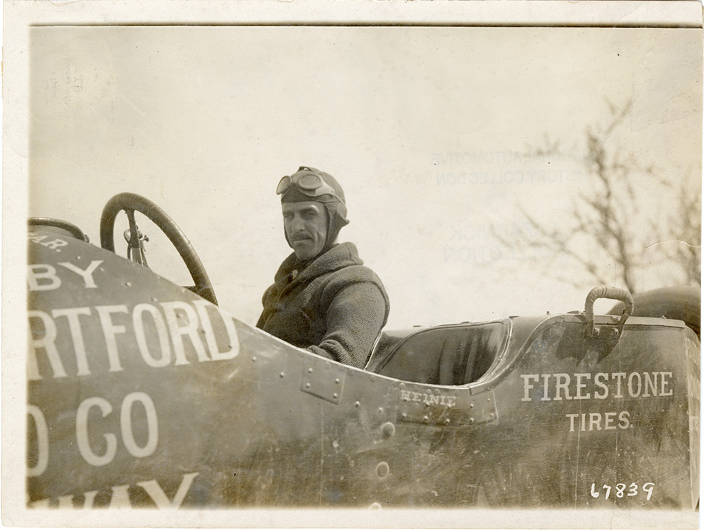 Close-up view of Louis Disbrow posing in Pope-Hartford racecar. Lettered on car: "Firestone tires. Heine." Stamped on back: "Spooner & Wells, Inc., photographers, telephones 3472-3473 Columbus, 1931 Broadway, New York." Handwritten on back: "Pope-Hartford."