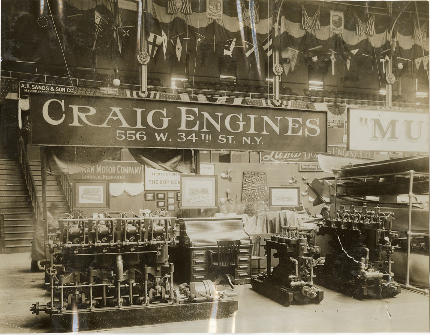 View of the Craig Engines display of marine engines at unidentified boat show. Sign over exhibit reads: "Craig Engines, 556 W. 34th St., N.Y." Roll-top desk in background. Handwritten on back: "Marine engines--Craig."