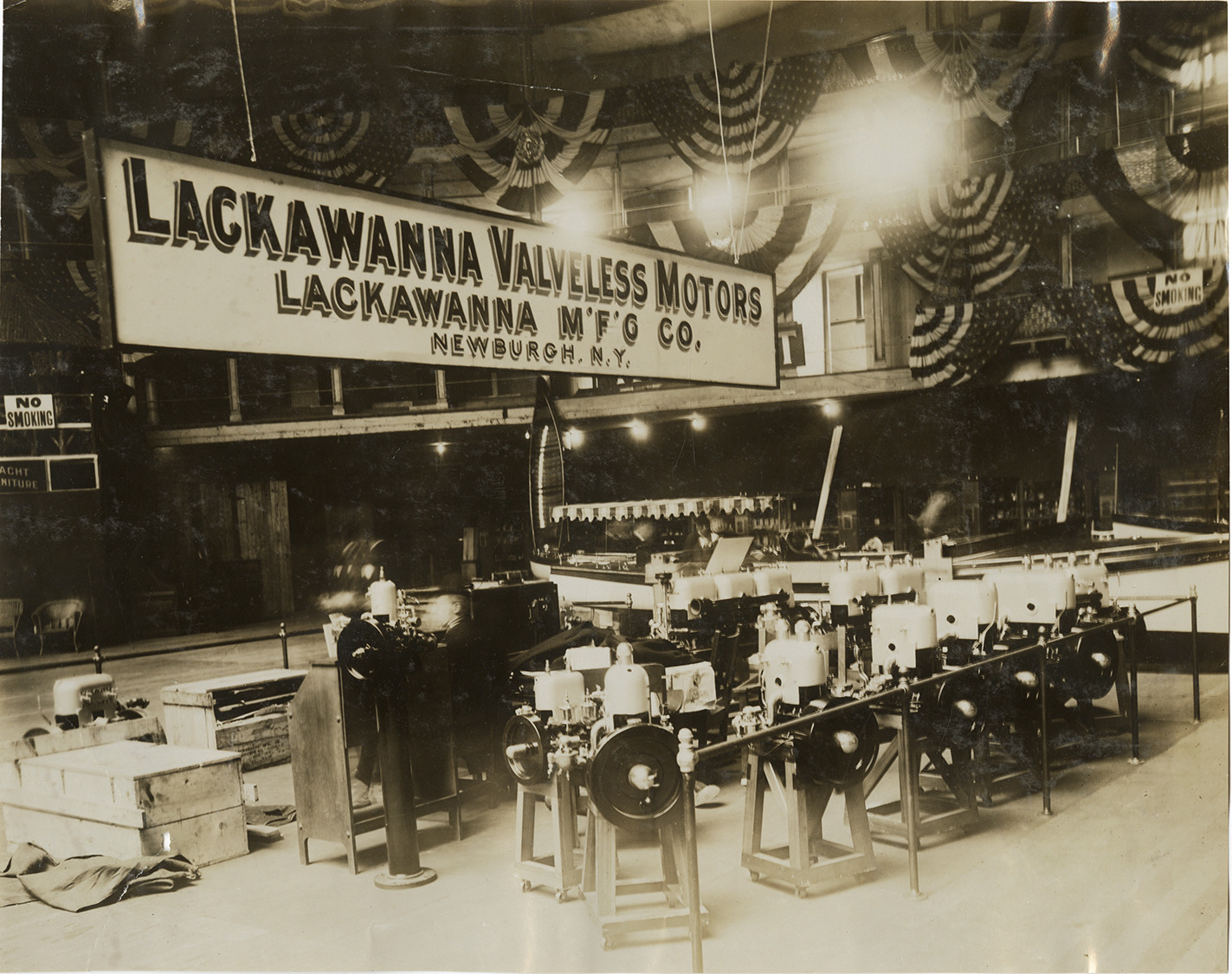 View of the Lackawanna Manufacturing Co. display of marine engines at unidentified boat show. Sign over exhibit reads: "Lackawanna valveless motors. Lackawanna M'f'g. Co., Newburgh, N.Y." Handwritten on back: "Marine engines--Lackawanna."