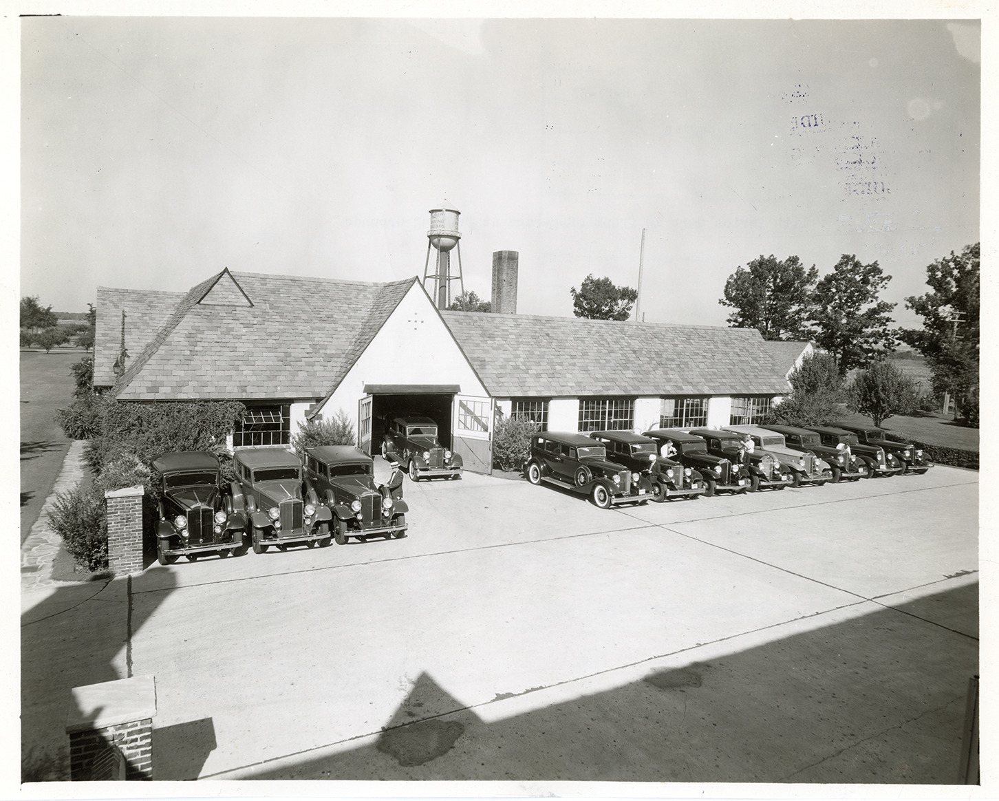 View of 1933 and 1934 Packard Eleventh series cars parked in front of the garage at the Packard Proving Grounds in Utica, Michigan. Tudor-style lodge and garage was designed by Albert Kahn. Typed on back: "Neg. no. 7294-A, 8-21-33. 11th Series. 11th Series cars in front of garage at Proving Grounds." Handwritten on back: "1933 Packard Tenth Series models & new 1934 Packard Eleventh Series test cars. Shops, Packard Proving Grounds."