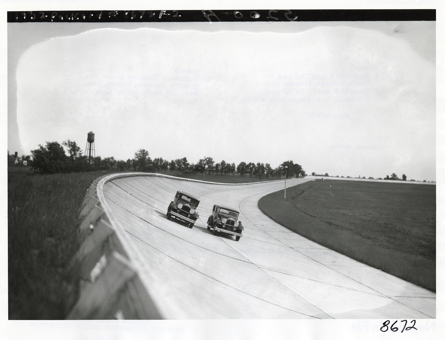 1932 and 1931 Packard automobiles racing on track, Packard Proving Grounds