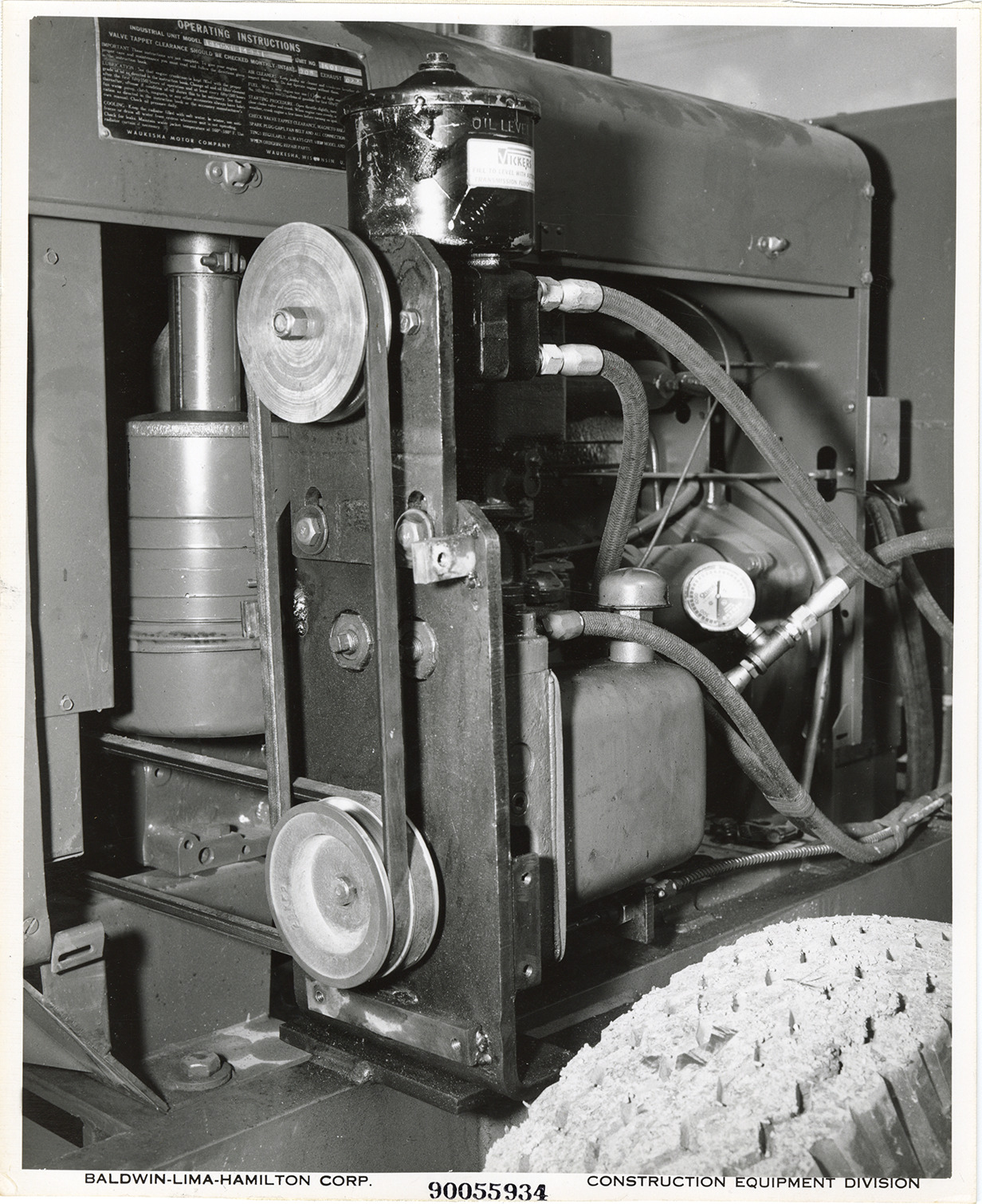 Close-up view of a Lima Super Roadpacker manufactured by the Baldwin-Lima-Hamilton Corporation. Printed on front: "Baldwin-Lima-Hamilton Corp. 90055934. Construction Equipment Division."