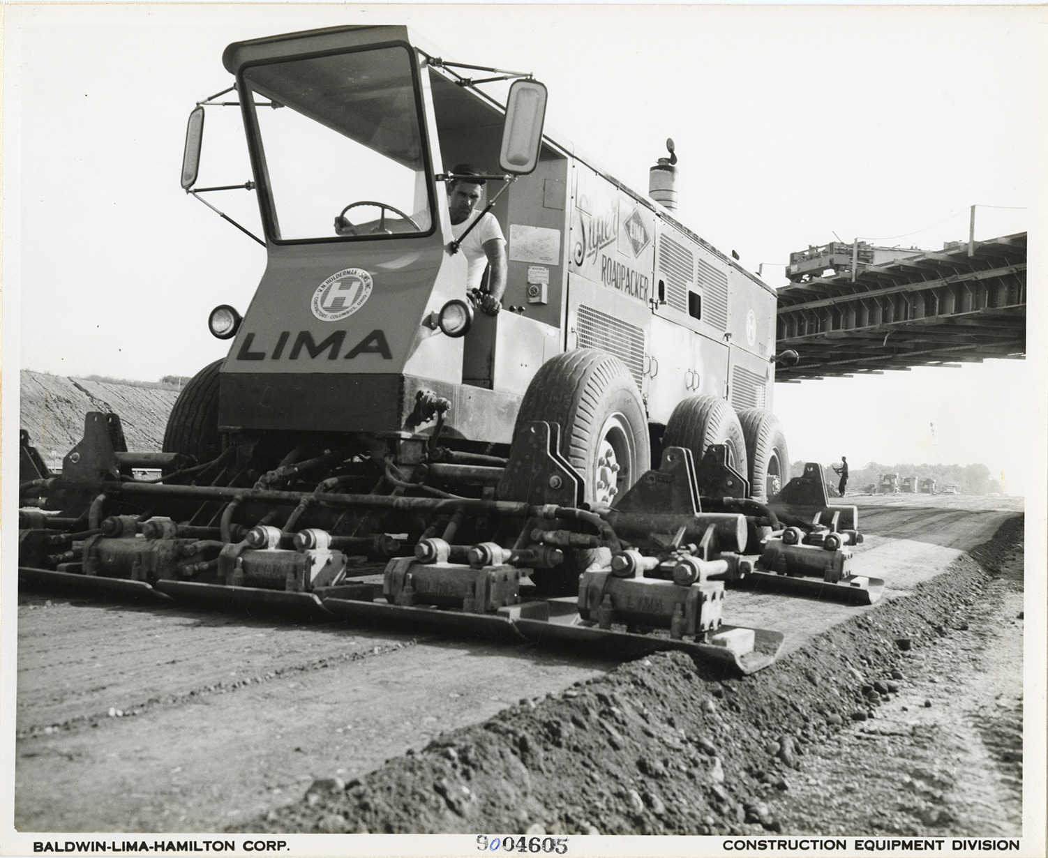 View of a worker operating a Lima Super Roadpacker near Mt. Gilead, Ohio. The Roadpacker was manufactured by the Baldwin-Lima-Hamilton Corporation. Printed on front: "Baldwin-Lima-Hamilton Corp. 9004605. Construction Equipment Division." Label on back: "Lima Super Roadpacker, #7006-1. Machine shown compacting on V.N. Holderman's SR 1 job near Mt. Gilead, Ohio. Owner: V.N. Holderman. Photo: Construction Digest."