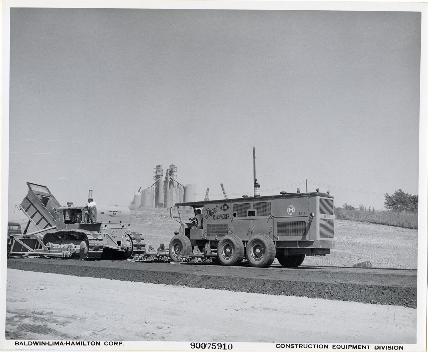 View of a worker operating a Lima Super Roadpacker manufactured by the Baldwin-Lima-Hamilton Corporation, following a Caterpillar bulldozer. Printed on front: "Baldwin-Lima-Hamilton Corp. 90075910. Construction Equipment Division."