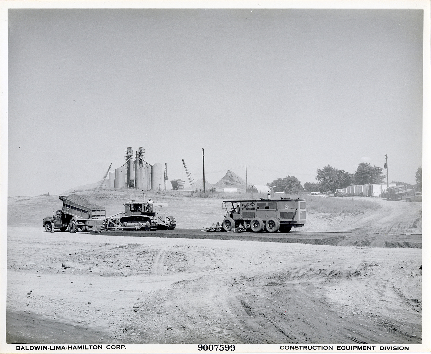 View of a worker operating a Lima Super Roadpacker manufactured by the Baldwin-Lima-Hamilton Corporation, following a dump truck and Caterpillar bulldozer. Printed on front: "Baldwin-Lima-Hamilton Corp. 9007599. Construction Equipment Division."
