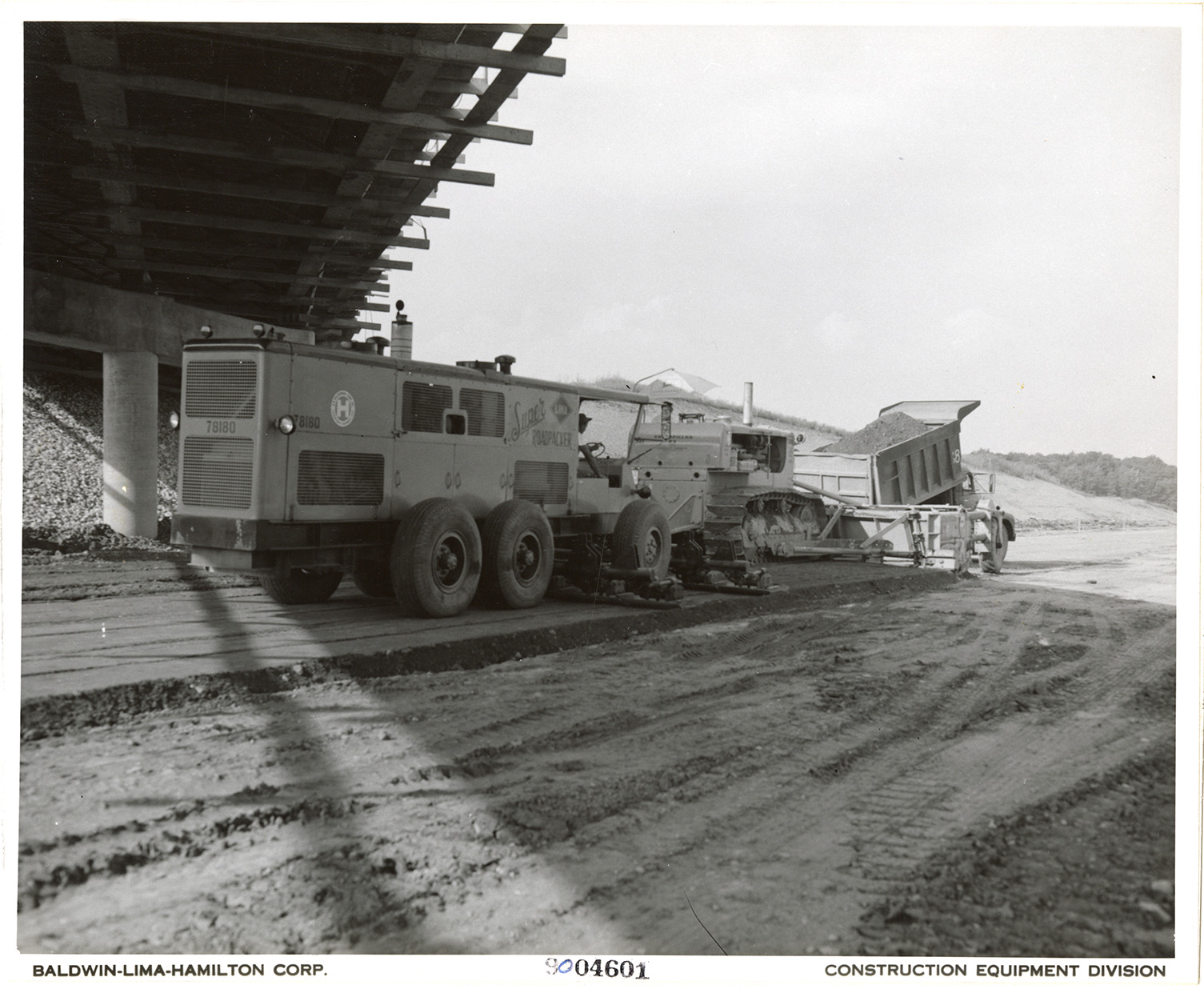 View of a worker operating a Lima Super Roadpacker, following a dump truck and Caterpillar bulldozer near Mt. Gilead, Ohio. The Roadpacker was manufactured by the Baldwin-Lima-Hamilton Corporation. Printed on front: "Baldwin-Lima-Hamilton Corp. 9004607. Construction Equipment Division." Label on back: "Lima Super Roadpacker, #7006-1. Machine shown compacting on V.N. Holderman's SR 1 job near Mt. Gilead, Ohio. Owner: V.N. Holderman. Photo: Construction Digest."