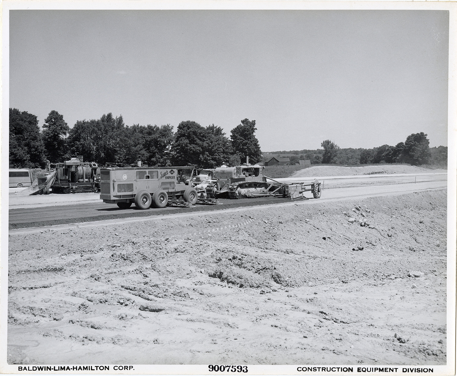 View of a worker operating a Lima Super Roadpacker, following a Caterpillar bulldozer. The Roadpacker was manufactured by the Baldwin-Lima-Hamilton Corporation. Printed on front: "Baldwin-Lima-Hamilton Corp. 9007593. Construction Equipment Division."
