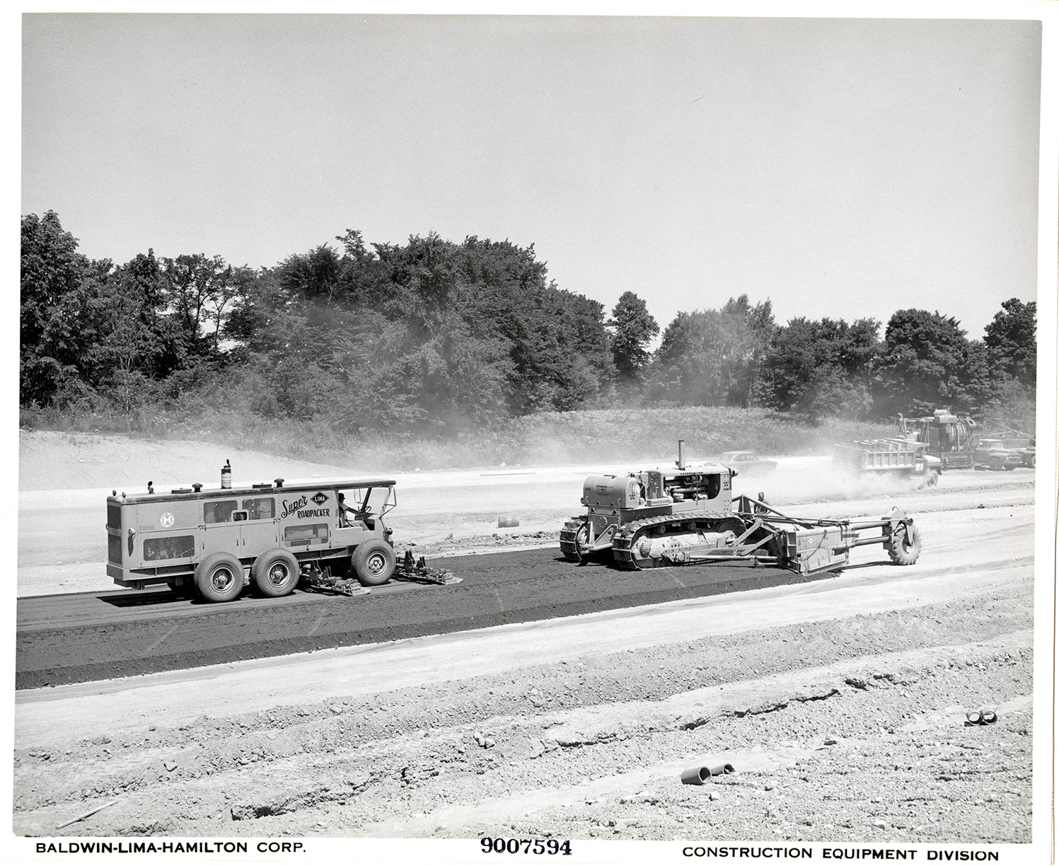 View of a worker operating a Lima Super Roadpacker, following a Caterpillar bulldozer. The Roadpacker was manufactured by the Baldwin-Lima-Hamilton Corporation. Printed on front: "Baldwin-Lima-Hamilton Corp. 9007594. Construction Equipment Division."