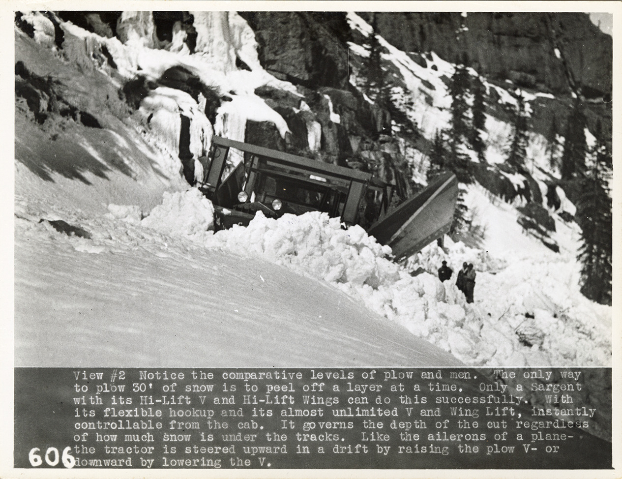 View of a Sargent Clertrac Model A hydraulic snowplow at Wolf Creek Pass in the Colorado Rockies. The snowplows were manufactured by the Maine Steel Products Co. in South Portland, Maine. Printed on front: "View #2. Notice the comparative levels of plow and men. The only way to plow 30' of snow is to peel off a layer at a time. Only a Sargent with its Hi-Lift V and Hi-Lift Wings can do this successfully. With its flexible hookup and its almost unlimited V and Wing Lift, instantly controllable from the cab. It governs the depth of the cut regardless of how much snow is under the tracks. Like the ailerons of a plane -- the tractor is steered upward in a drift by raising the plow V, or downward by lowering the V."