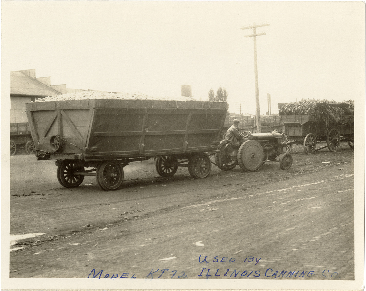 View of a tractor pulling a load of corn in a Model KT72 trailer, manufactured by the Kentucky Wagon Manufacturing Co. in Louisville, Kentucky. Wagon loaded with cornstalks on right. Handwritten on front: "Model KT72, used by Illinois Canning Co."