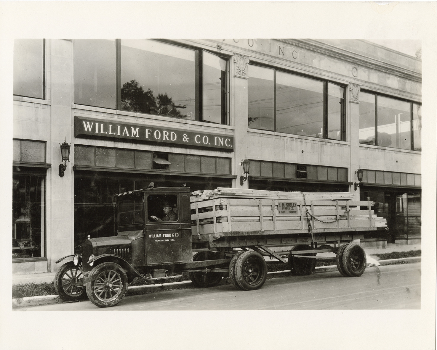 View of driver posing in a truck for William Ford & Co. with a Kingham "Old Hickory" stake bed trailer, manufactured by the Kentucky Wagon Manufacturing Co. in Louisville, Kentucky. Truck is carrying a load of lumber. Sign on truck cab reads: "William Ford & Co., Highland Park, Mich." Sign on trailer reads: "F.M. Sibley Lumber Co. 4 yards. Edgewood." William Ford & Co. Inc. building in background.