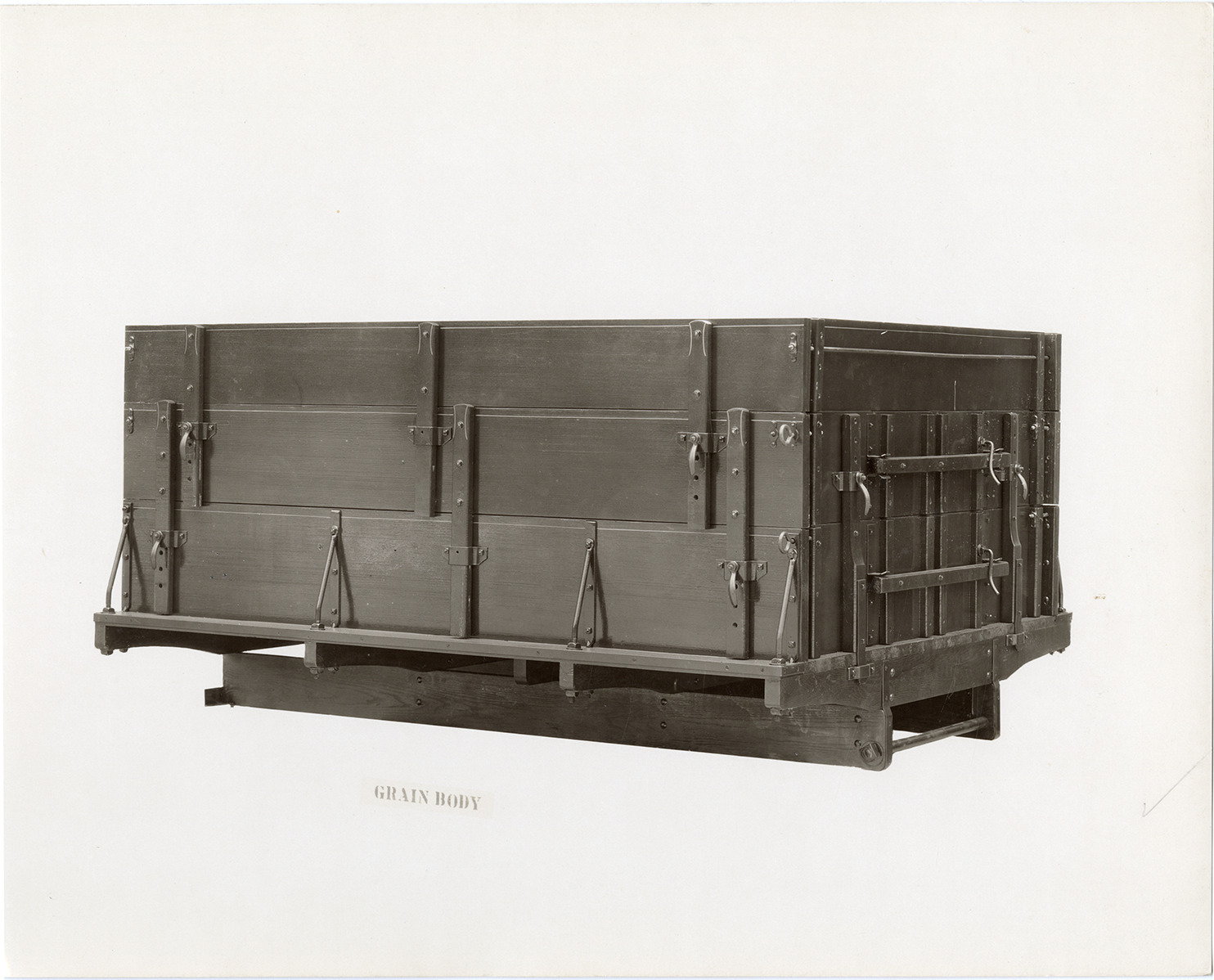 View of a grain body truck trailer bed, manufactured by the Kentucky Wagon Manufacturing Co. in Louisville, Kentucky. Printed on front: "Grain body." Stamped on back: "Hesse, photographer. Louisville, Ky."