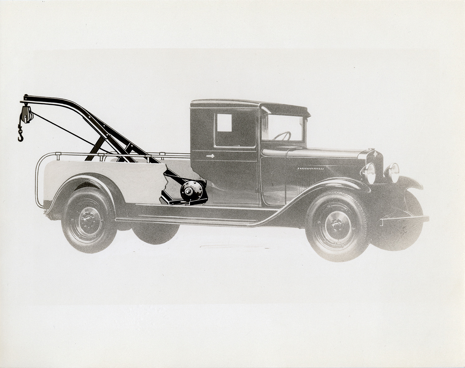Artist's depiction of a truck with winch, manufactured by the Kentucky Wagon Manufacturing Co. in Louisville, Kentucky. Stamped on back: "Hesse, photographer. Louisville, Ky."