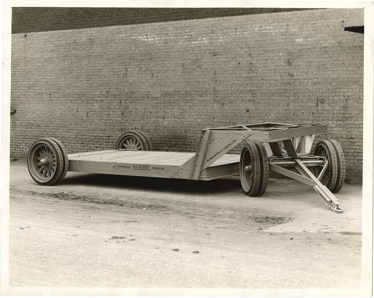 View of a Kingham "Old Hickory" flatbed trailer, manufactured by the Kentucky Wagon Manufacturing Co. in Louisville, Kentucky. Stamped on back: "Hesse, photographer, Louisville, Ky."