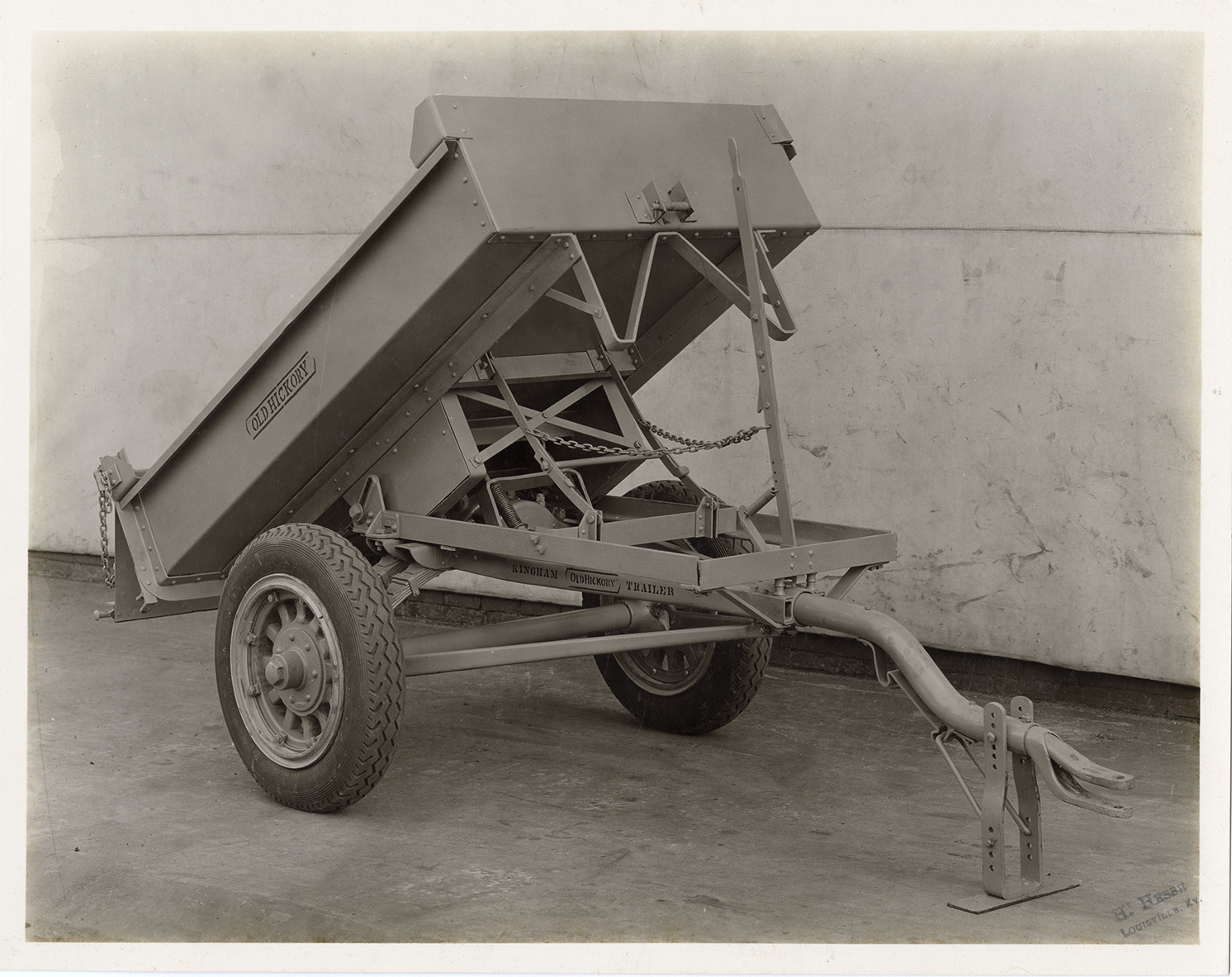 View of a Kingham "Old Hickory" dump trailer, manufactured by the Kentucky Wagon Manufacturing Co. in Louisville, Kentucky. Lettered on trailer: "Kingham 'Old Hickory' trailer." Stamped on front: "H. Hesse, Louisville, Ky." Stamped on back: "Hesse, photographer, Louisville, Ky."