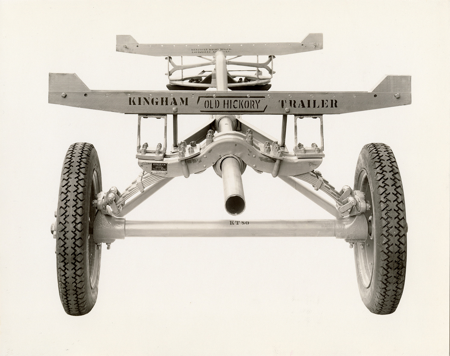 Front view of a Kingham "Old Hickory" flatbed trailer, manufactured by the Kentucky Wagon Manufacturing Co. in Louisville, Kentucky. Lettered on trailer: "Kingham 'Old Hickory' trailer. Kentucky Wagon Mfg. Co., Louisville, Ky." Stamped on back: "Hesse, photographer, Louisville, Ky."