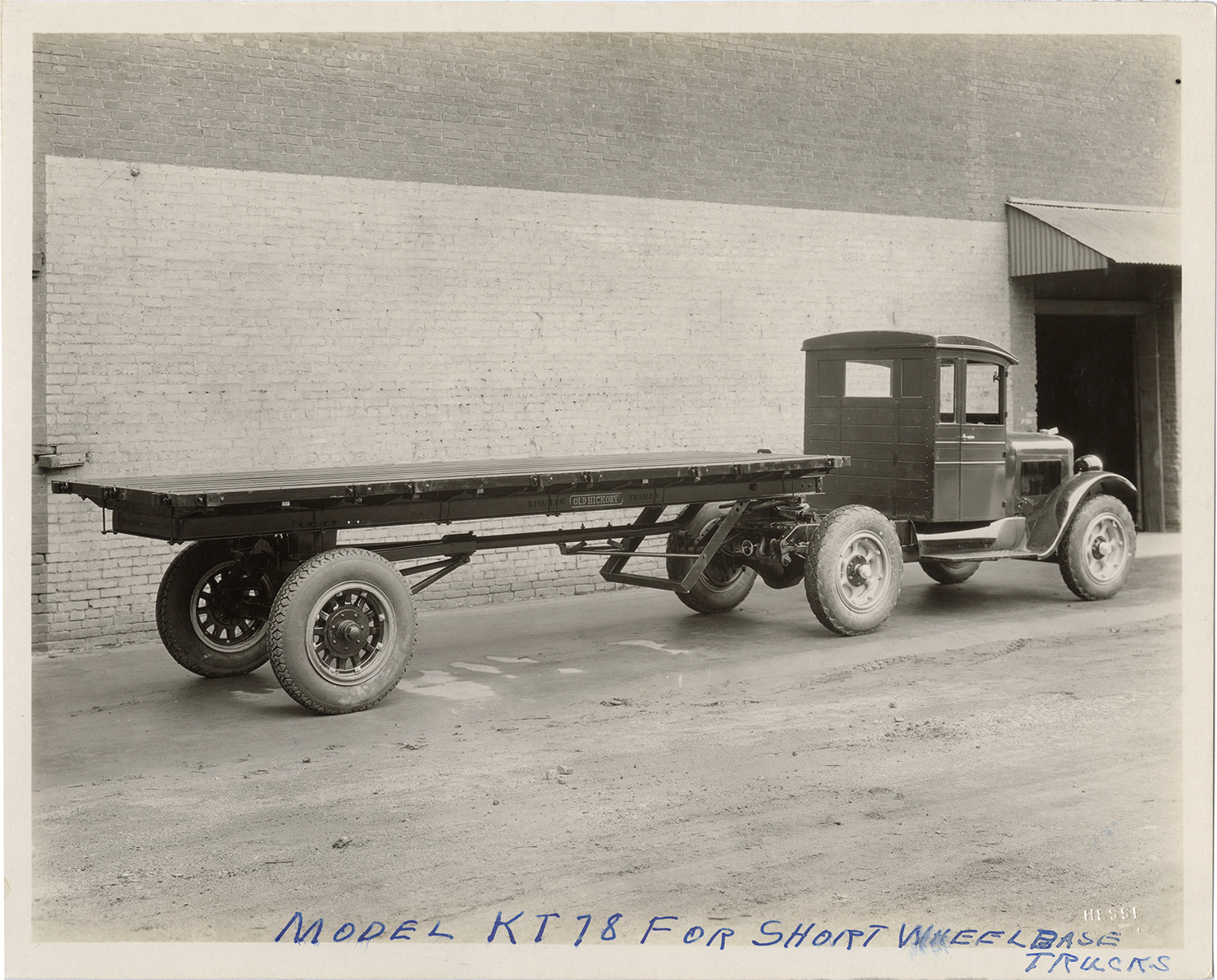 View of a truck with a Kingham "Old Hickory" Model KT78 flatbed trailer, manufactured by the Kentucky Wagon Manufacturing Co. in Louisville, Kentucky. Lettered on trailer: "Kingham 'Old Hickory' trailer." Embossed on front: "Hesse, Louisville." Handwritten on front: "Model KT78 for short wheelbase trucks."