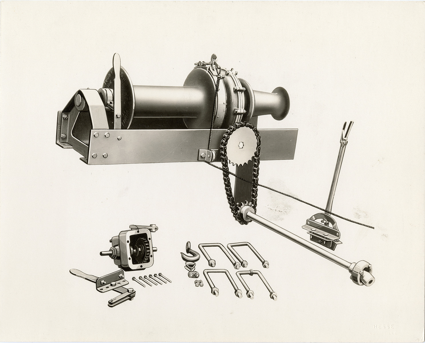 Artist's depiction of a winch and its components, manufactured by Kentucky Wagon Manufacturing Co. in Louisville, Kentucky. Embossed on front: "Hesse, Louisville."