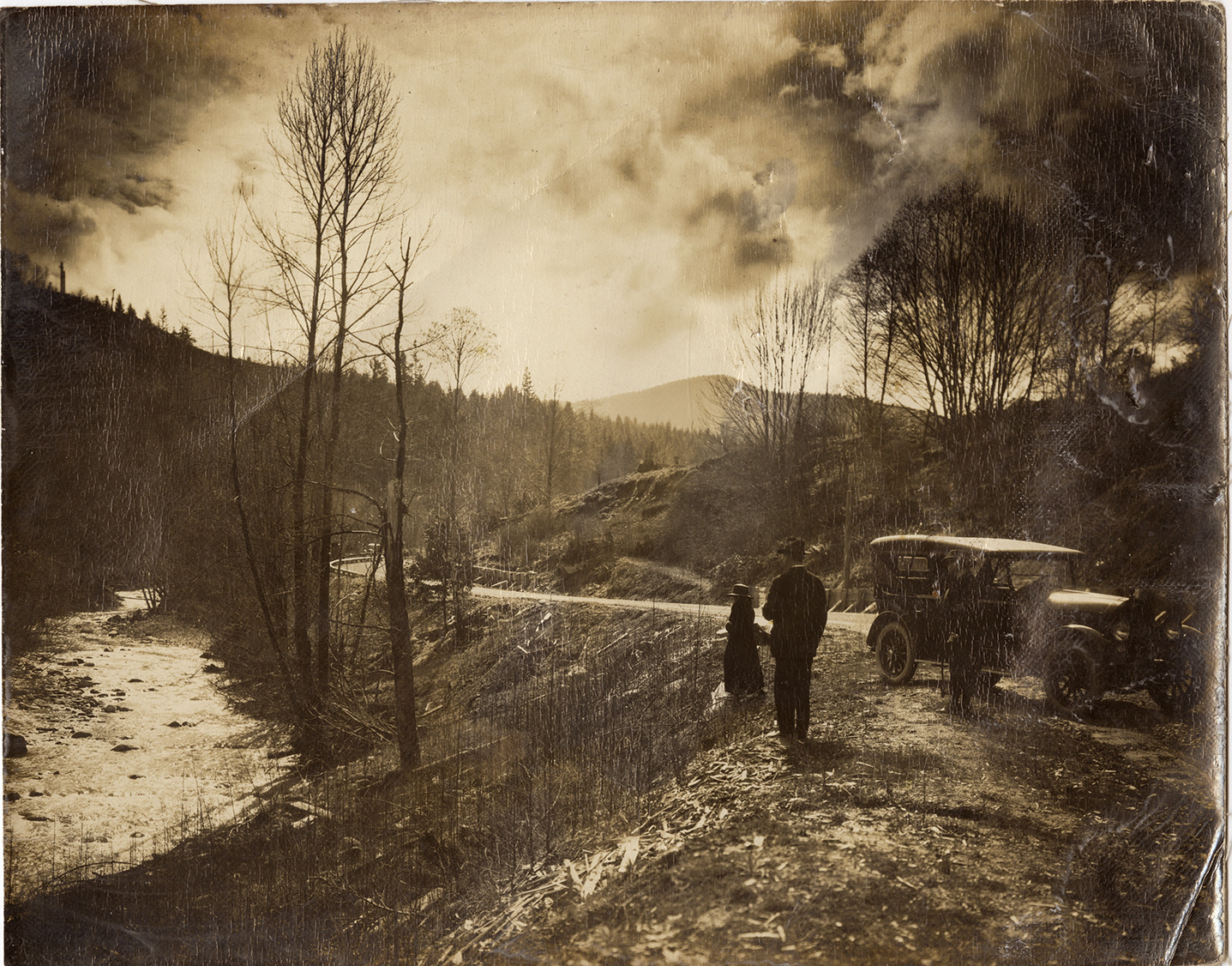 Motorists posing with 1918 Stearns automobile, Columbia River Gorge
