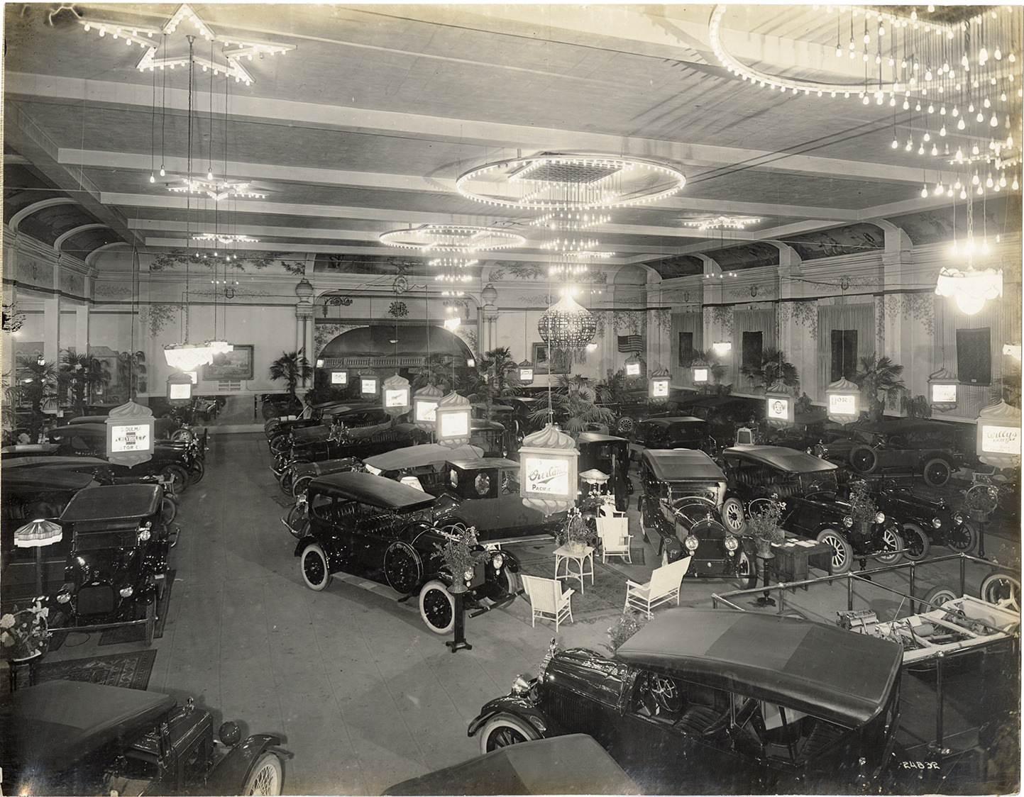 View of Willys-Overland cars on display at the 1921 Seattle Automobile Show. Chevrolet exhibit on left; automobile chassis in foreground.