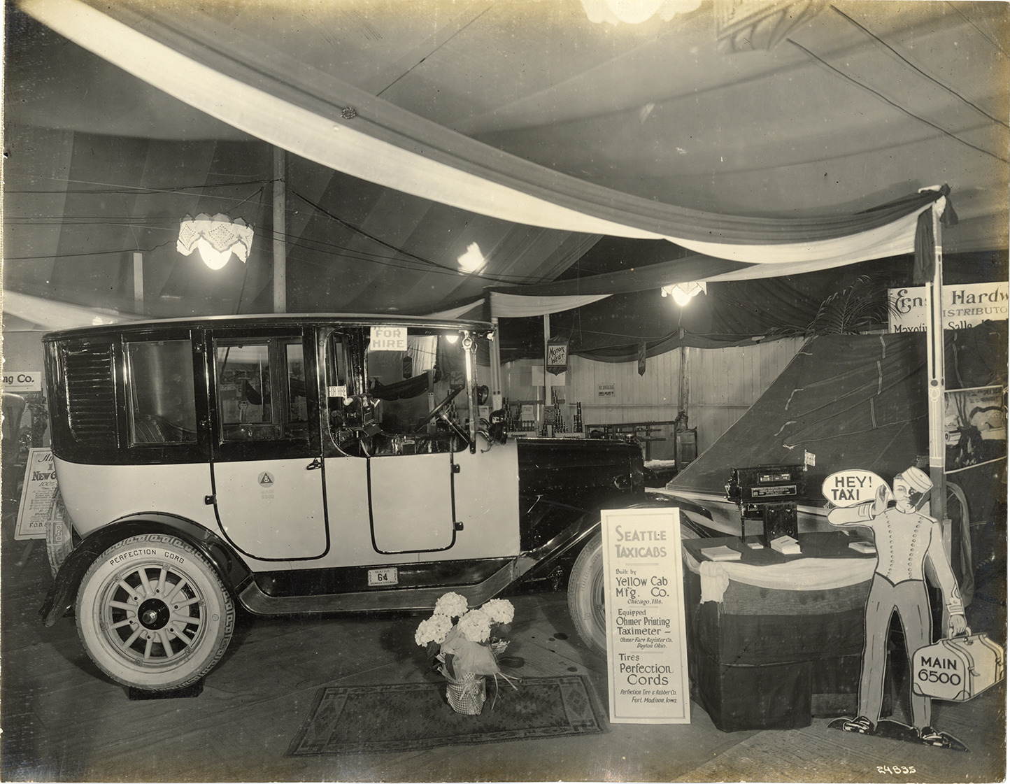 View of the Seattle Taxicab Co. exhibit at the 1921 Seattle Automobile Show. Display includes a taxicab and cutout of a bellboy holding a valise. Bouquet of hydrangeas in vase in foreground; Ohmer taximeter in background. Sign in foreground reads: "Seattle Taxicabs. Built by Yellow Cab Mfg. Co., Chicago, Ills. Equipped Ohmer printing taximeter, Ohmer Fare Register Co., Dayton, Ohio. Tires, Perfection Cords, Perfection Tire & Rubber Co., Fort Madison, Iowa."