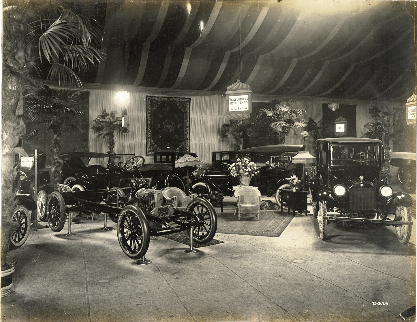 View of Dodge cars and chassis on display at the 1921 Seattle Automobile Show. Sign in background reads: "Dodge Brothers motor cars, W.L. Eaton." Floral arrangements in exhibit.