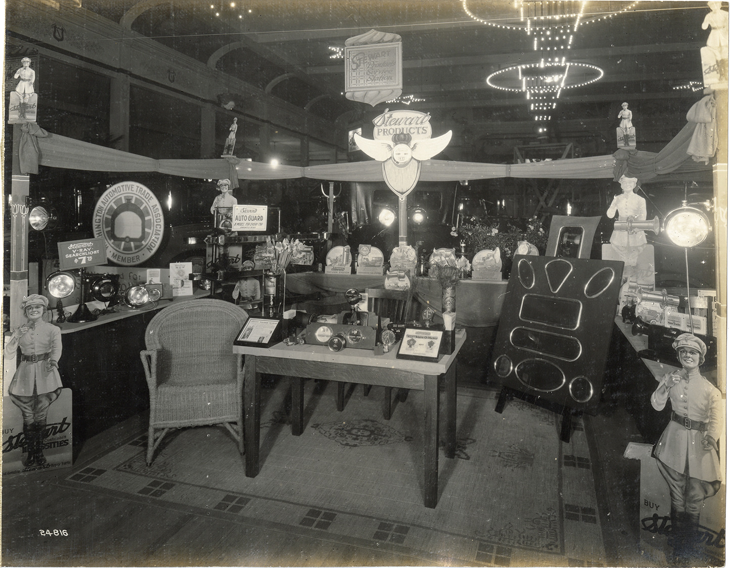 View of the Stewart Products exhibit at the 1921 Seattle Automobile Show. Display includes speedometers, odometers, searchlights, headlamps, horns and other accessories. Signs in display read: "Stewart Products" and "Stewart Products service station."