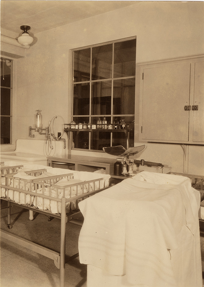 View of bassinet room at the Florence Crittenton Hospital. Scale and sink in background. Stamped on back: "When reproduced kindly give credit to D.D. Spellman, photographer" and "Free Press." Handwritten on back: "Bassinet rooms of the Florence Crittenton home."