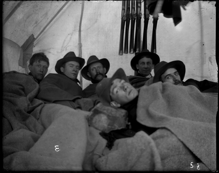 Favorite this☆ Soldiers in tent at Camp Eaton Description: View of soldiers resting in tent at Camp Eaton at Island Lake, Michigan; soldiers wear hats and are covered with blankets; rifles hang from tent wall. Recorded in ledger: "Sergt. Thompson, tent squad at reast [sic]." Details Resource ID: SPAW005 Creator: Lake, Alma Subject: Spanish-American War, 1898 Military camps--Michigan--Livingston County Tents--Michigan--Livingston County Soldiers--Michigan Photographers--Michigan Glass negatives Date Issued: 1898-05-01 Format: 1 negative : glass ; 4 x 5 in. Member of: Burton Historical Collection Negative Number: SPAW glass neg. no. E Rights: Physical rights are retained by DPL. Copyright is retained in accordance with U.S. copyright laws.