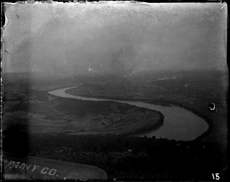 Aerial view of bend in Tennessee River near Chickamauga Park, Tennessee. Recorded in ledger: "Hores [sic] Shoe Bend of Chattanuga [sic] River from Lookout Mt."