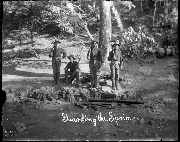 Four soldiers carrying rifles stand guard at spring or creek at Chickamauga Park, Tennessee; trees in background. Written on image: "Guarding the spring." Recorded in ledger: "Guarding the spring, (l. to r.) Pvt. Harry L. Gutchess, Sergt. Frederick M. Slater, Corp. James E. Lee, Pvt. Jacob Shires."