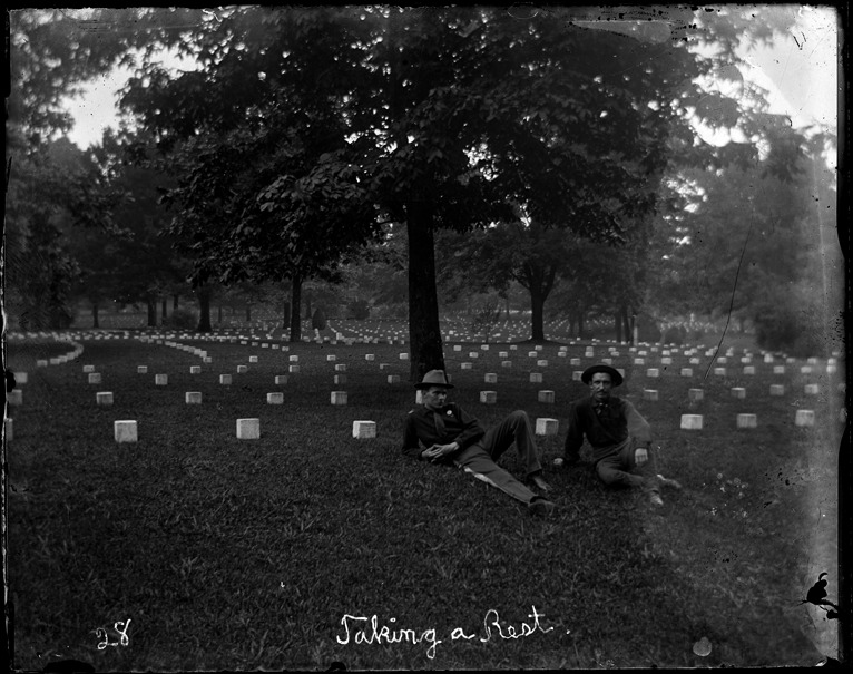 Two uniformed soldiers rest in Chattanooga National Cemetery under a tree; rows of grave markers in background. Written on image: "Taking a rest." Recorded in ledger: "Taking a rest, Lt. V.R. Evans & Pvt. E.L. McFern, thousands of grave markers in background."