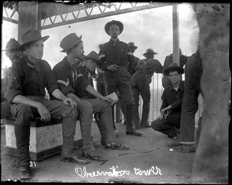 Group of soldiers gather on deck of observation tower on Lookout Mountain. Written on image: "Observation tower." Recorded in ledger: "Observation tower on Lookout Mt. (l. to r.) Pvt. Harry L.Gutchess, Corp. Shirley N. Fisk, ?, Serg. A. Lake, ?"