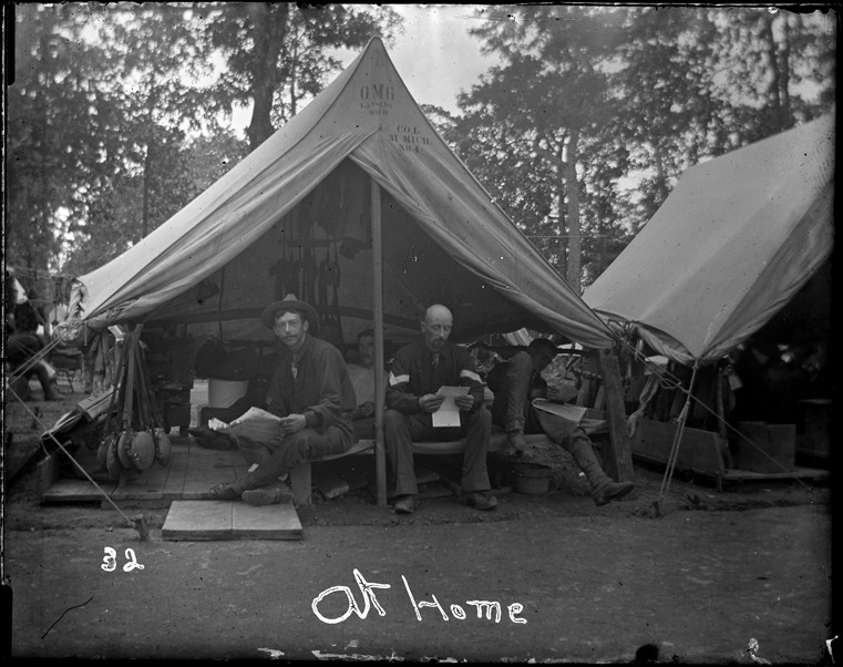 Favorite this☆ Soldiers reading in tent Description: Group of soldiers read in tent at Chickamauga Park, Tennessee; canteens hang from side of tent. Written on image: "At home." Recorded in ledger: "At home, Sergt Lake's tent at 2d. camp site, Chickamauga Pk., (l. to r.) Pvt. Wm. R. Kieler." Details Resource ID: SPAW020 Creator: Lake, Alma Subject: Spanish-American War, 1898 Tents--Tennessee Chickamauga and Chattanooga National Military Park (Ga. and Tenn.) Soldiers--Michigan Photographers--Michigan Glass negatives Date Issued: 1898 to 1899 Format: 1 negative : glass ; 4 x 5 in. Member of: Burton Historical Collection Negative Number: SPAW glass neg. no. 32 Rights: Physical rights are retained by DPL. Copyright is retained in accordance with U.S. copyright laws.