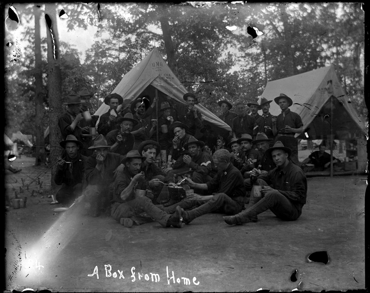 Group of soldiers gather outside of two tents; camp located at Chickamauga Park, Tennessee; some men hold cups, food or pipes; two men in front hold a bowl with spoons. Written on image: "A box from home." Recorded in ledger: "A box form [sic] home, a bunch of Co. L. in front of Sergt. Lake's tent."