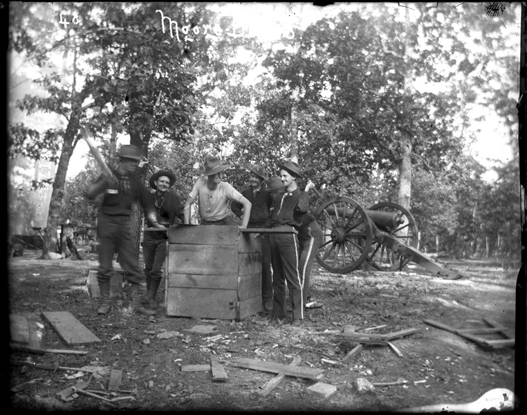Group of soldiers construct a wooden box with tools; camp located at Chickamauga Park, Tennessee; lumber and debris in foreground; cannon in background. Recorded in ledger: "Building a box for sink hole, (l. to r.) Pvt. Herbert W. Seaman, Mus. Clyde M. Webster, Sergt. Herry C. Mower, Pvt. Henry Clark, Sergt. Frederick M. Slater."