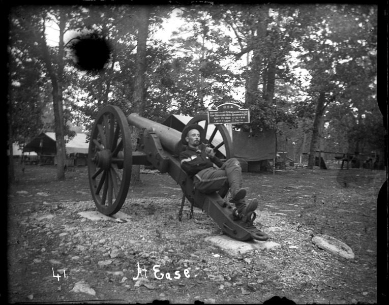Soldier identified as Alma Lake smokes a pipe while resting on a cannon; tents in background; camp located at Chickamauga Park, Tennessee. Sign next to cannon: "U.S.A. Battery 14th U.S. Stephenson's section, Van Derveer's Brig Brannan's Div., Sept. 19, 1863, 12 to 1 p.m., Lieut. Frank G. Smith." Recorded in ledger: "Sergt. A. Lake taking a smoke on a cannon."