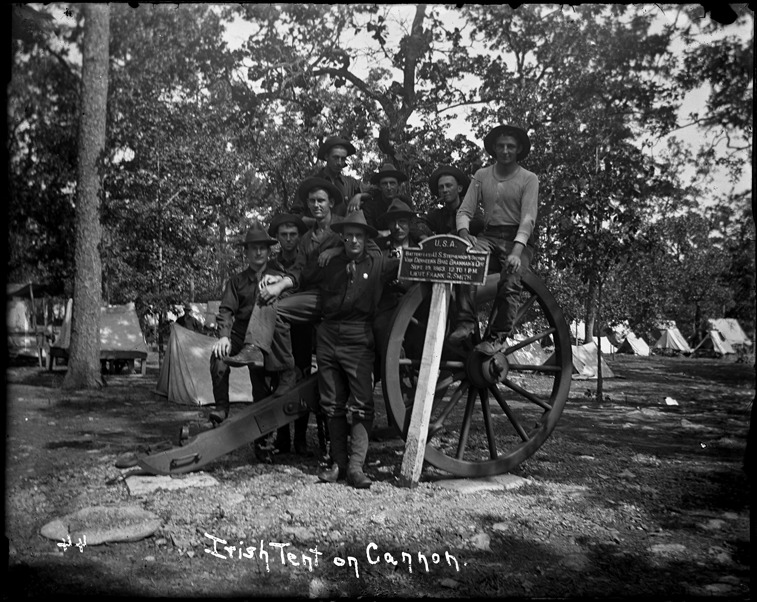 Group of soldiers pose on cannon in camp at Chickamauga Park, Tennessee; tents in background. Sign next to cannon: "U.S.A. Battery 14th U.S. Stephenson's section, Van Derveer's Brig Brannan's Div., Sept. 19, 1863, 12 to 1 p.m., Lieut. Frank G. Smith." Written on image: "Irish tent on cannon." Recorded in ledger: "The Irish tent on cannon, (l. to r.) top row, Walter J. Kershner, Martin K. Whelan, Harry J. Maloy, Julius Weiss, 2d. row, Charles P. Falvey, Corp. Wm. B. Wilbur, Wagner Robert J. Widrig, Harry J. Bramble, standing, Corp. Joe M. Hughes."