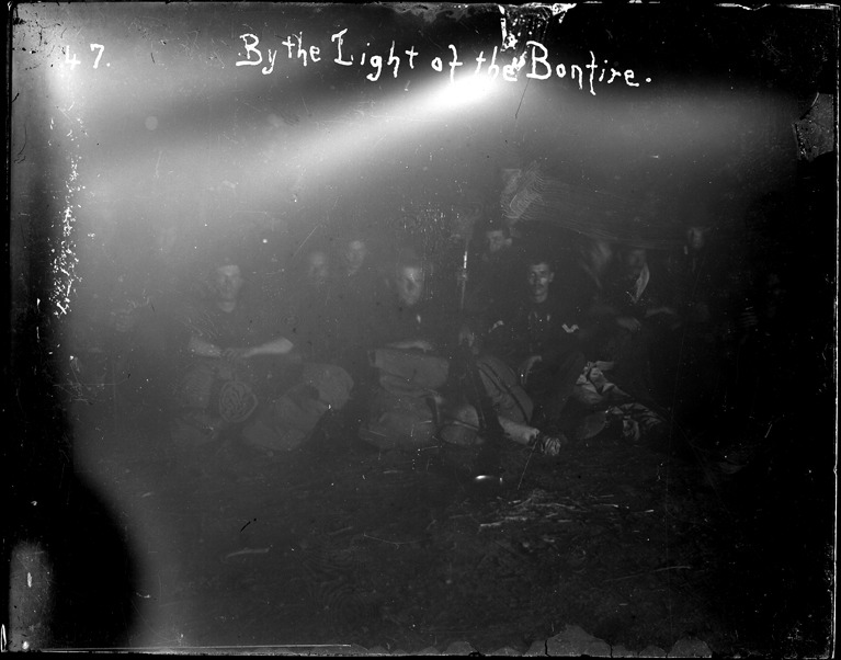 Group of soldiers with knapsacks gather near bonfire at night; camp located at Chickamauga Park, Tennessee. Written on image: "By the light of the bonfire." Recorded in ledger: "By the light of a bonfire, the lase [sic] night at Chickamouga [sic] Pk."