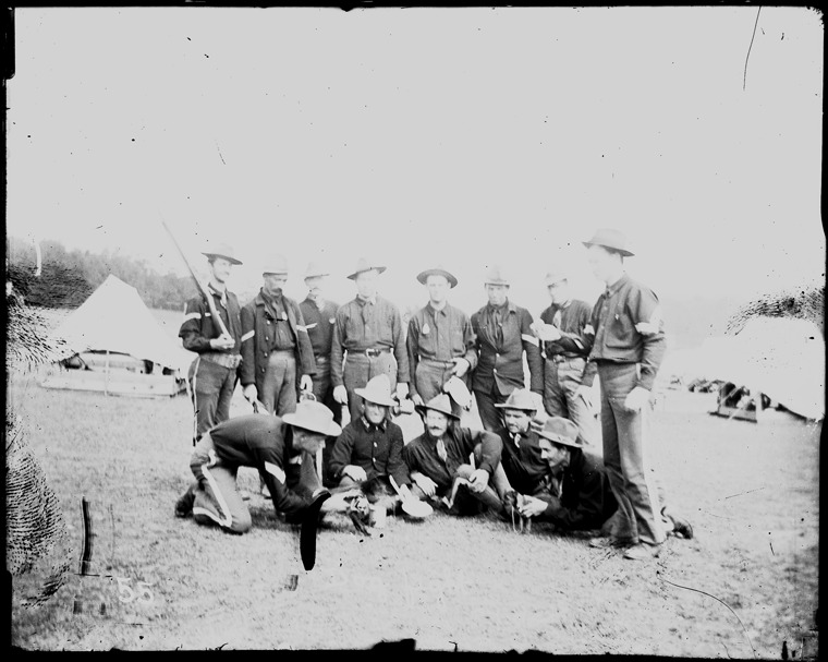 Favorite this☆ Soldiers in camp with dogs Description: Soldiers pose in semicircle around two kneeling soldiers who each hold a small dog; camp located in Knoxville, Tennessee. Recorded in ledger: "Dog fight of pets." Details Resource ID: SPAW040 Creator: Lake, Alma Subject: Spanish-American War, 1898 Soldiers--Michigan Dogs--Tennessee--Knoxville Military camps--Tennessee--Knoxville Photographers--Michigan Glass negatives Date Issued: 1898 to 1899 Format: 1 negative : glass ; 4 x 5 in. Member of: Burton Historical Collection Negative Number: SPAW glass neg. no. 55 Rights: Physical rights are retained by DPL. Copyright is retained in accordance with U.S. copyright laws.