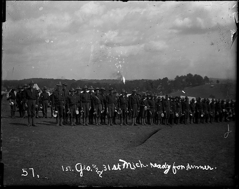 Favorite this☆ Soldiers with mess kits Description: Line of uniformed soldiers stand in field holding mess kits; camp located in Knoxville, Tennessee. Written on image: "1st Geo. and 31st Mich. ready for dinner." Recorded in ledger: "Co. L. 1st Geogia [sic] & 31st Mich. ready for a joint dinner." Details Resource ID: SPAW042 Creator: Lake, Alma Subject: Spanish-American War, 1898 United States. Army. Michigan Infantry Regiment, 31st (1898-1899) Soldiers--Michigan Soldiers--Georgia Military camps--Tennessee--Knoxville Mess kits--Tennessee--Knoxville Photographers--Michigan Glass negatives Date Issued: 1898 to 1899 Format: 1 negative : glass ; 4 x 5 in. Member of: Burton Historical Collection Negative Number: SPAW glass neg. no. 57 Rights: Physical rights are retained by DPL. Copyright is retained in accordance with U.S. copyright laws.
